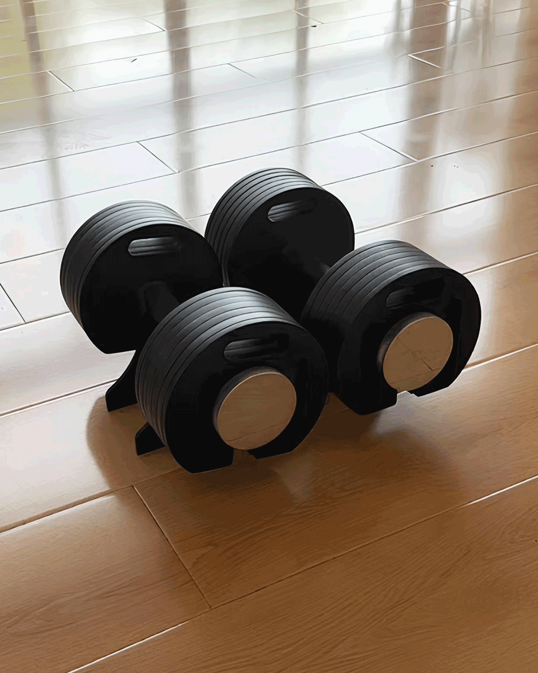 Set di manubri regolabili "plate-loaded" (a carico scalabile). Il peso viene modificato manualmente aggiungendo, rimuovendo o sostituendo le piastre sulla maniglia-asta e bloccandole con le apposite viti.