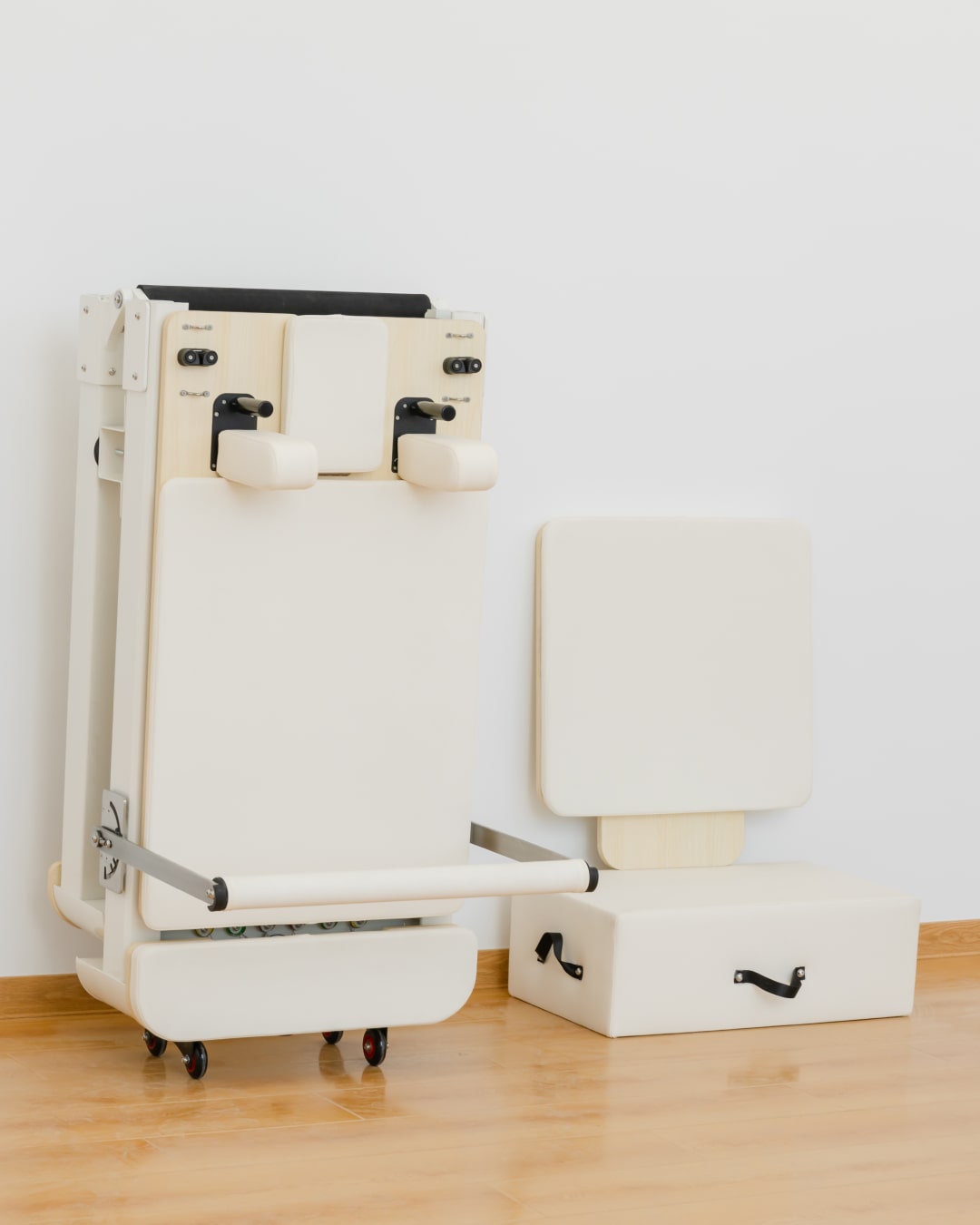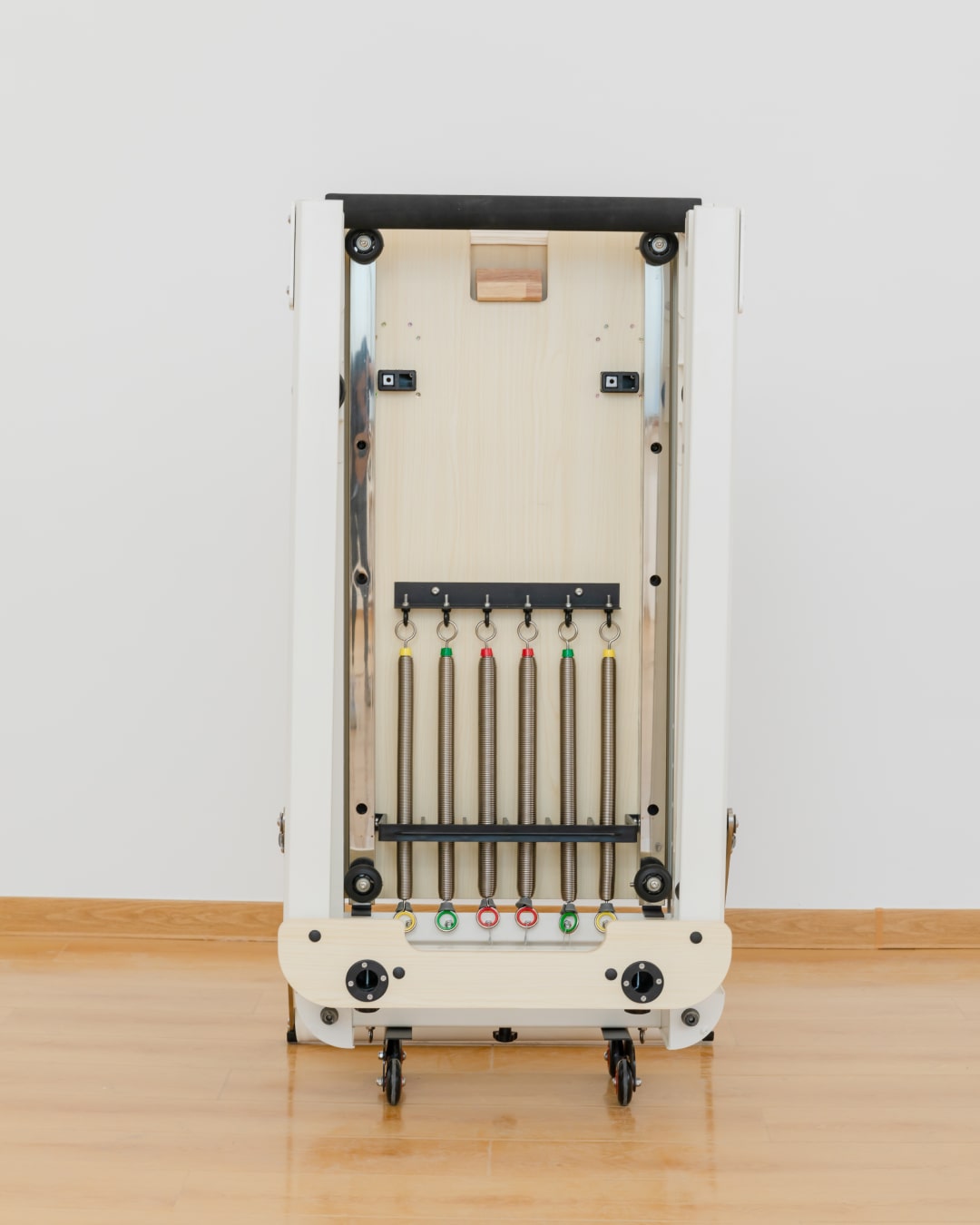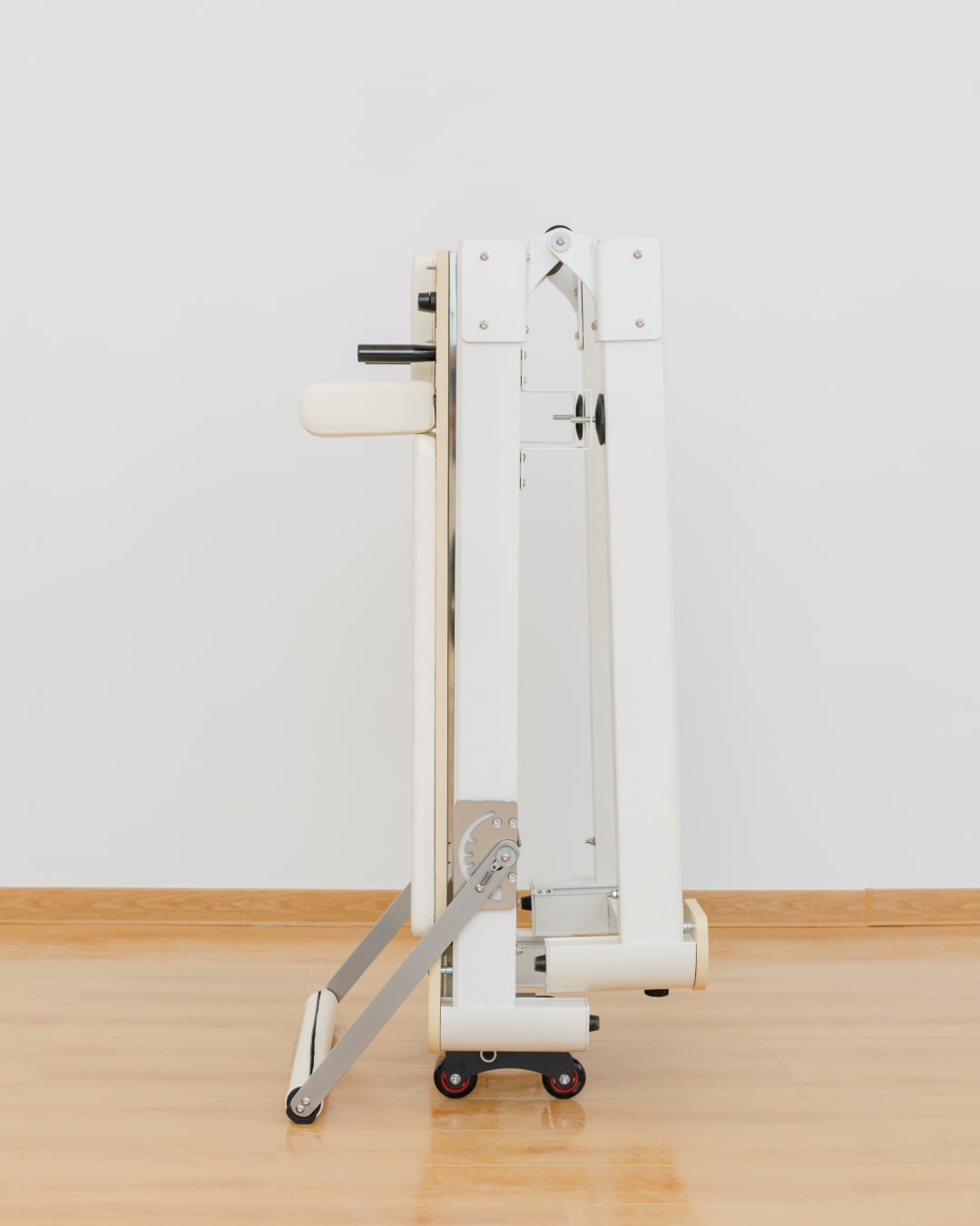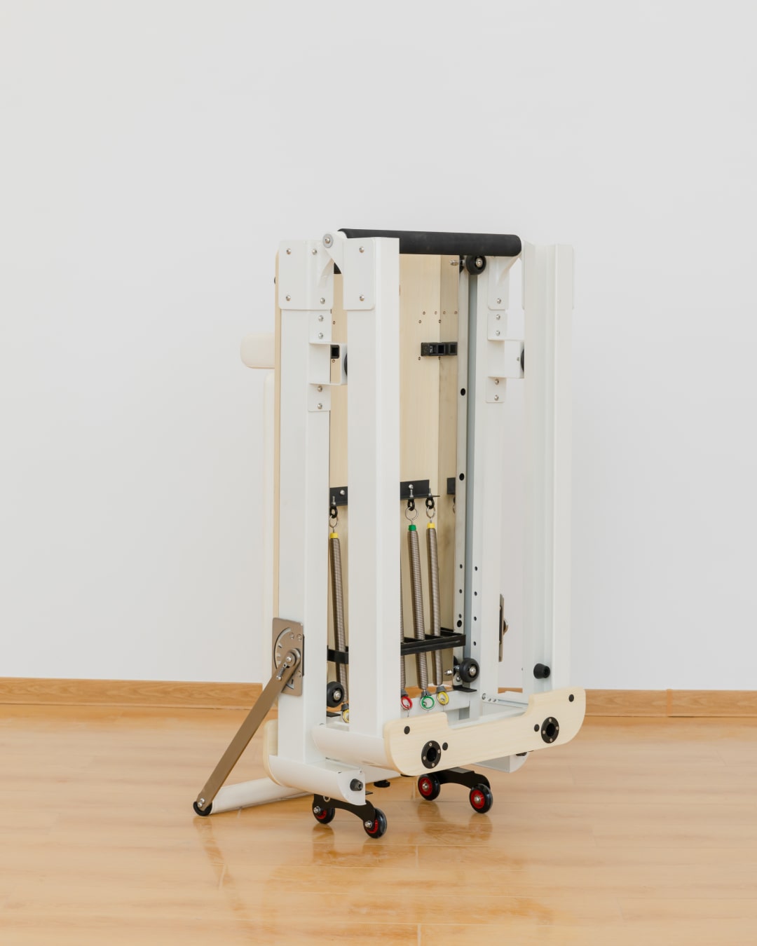Un reformer pieghevole che unisce la precisione dello studio professionale alla praticità domestica. Progettato per rispettare i principi della contrologia, offre innumerevoli variazioni di esercizi, supportando tutte le posture fondamentali (supino, prono, seduto, in ginocchio). Si trasforma in un ingombro di soli 0.3mq, ideale per home studio e centri con spazi limitati.