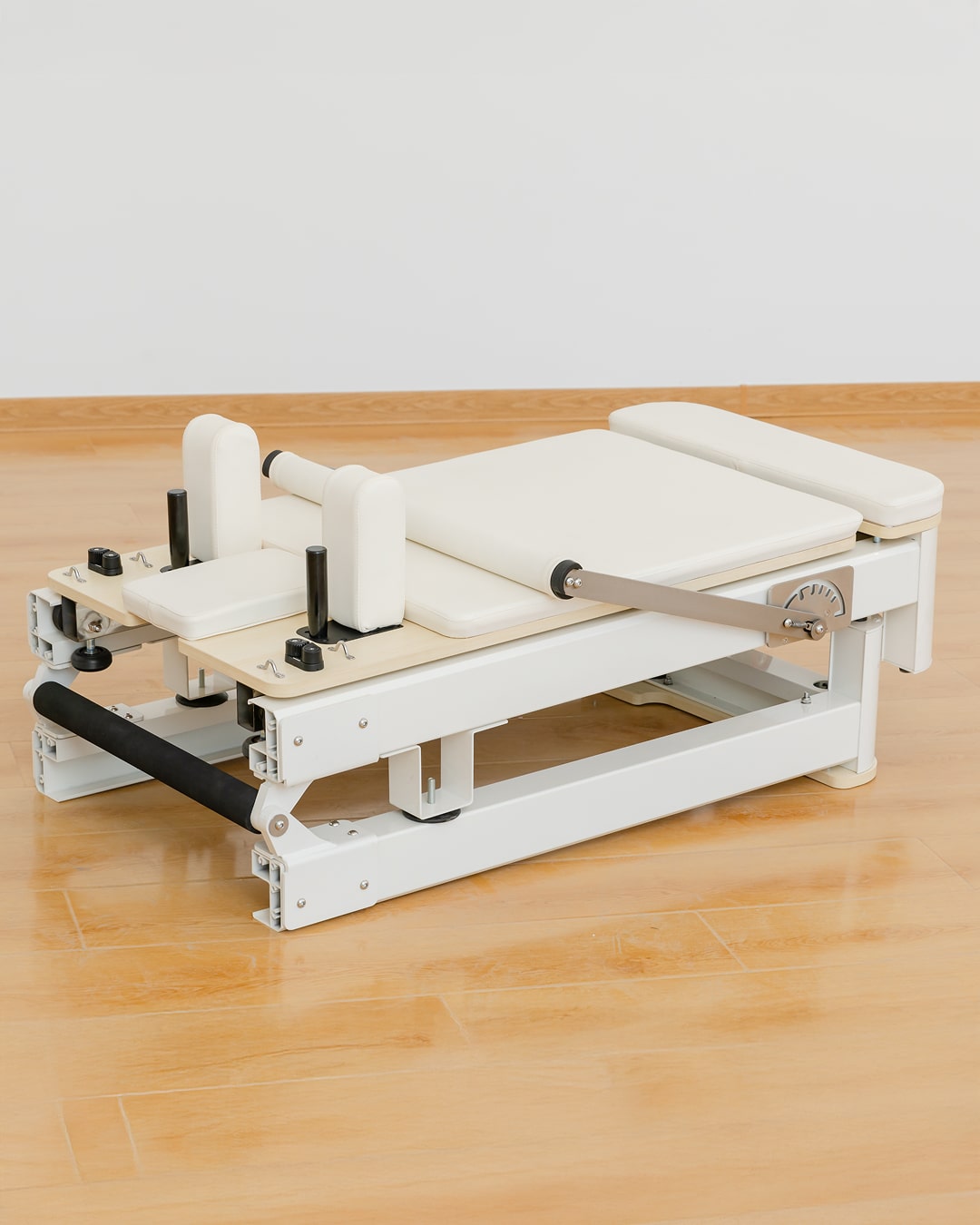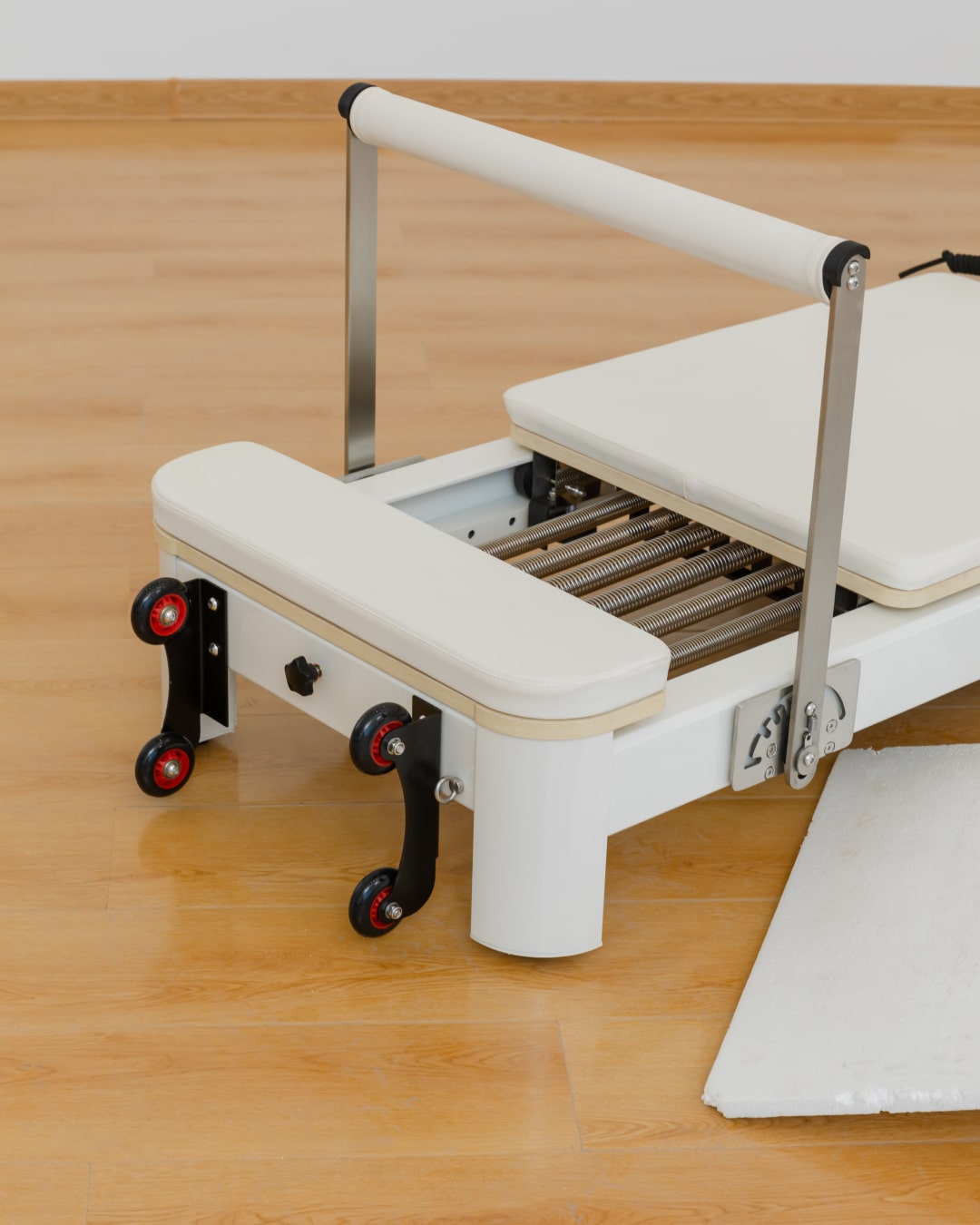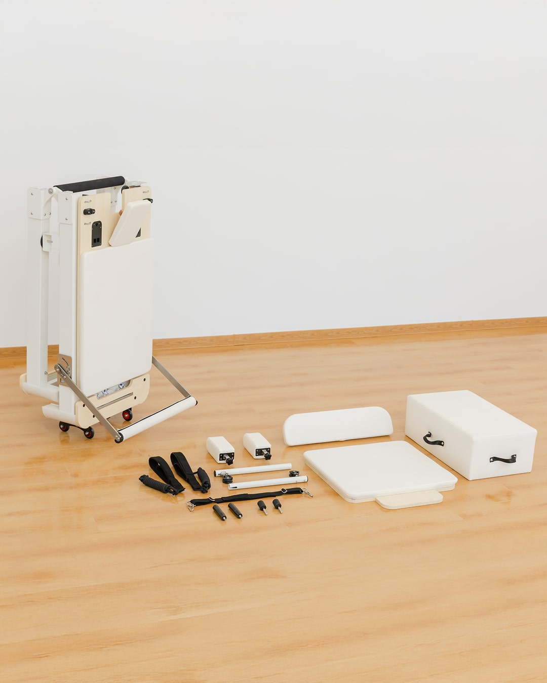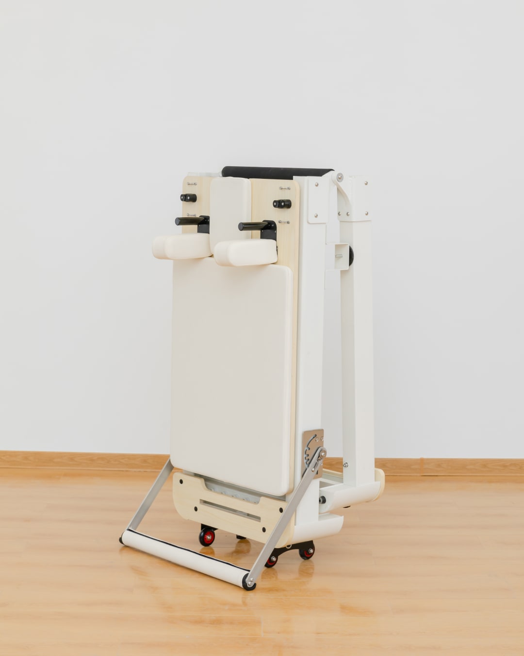 Un reformer pieghevole che unisce la precisione dello studio professionale alla praticità domestica. Progettato per rispettare i principi della contrologia, offre innumerevoli variazioni di esercizi, supportando tutte le posture fondamentali (supino, prono, seduto, in ginocchio). Si trasforma in un ingombro di soli 0.3mq, ideale per home studio e centri con spazi limitati.