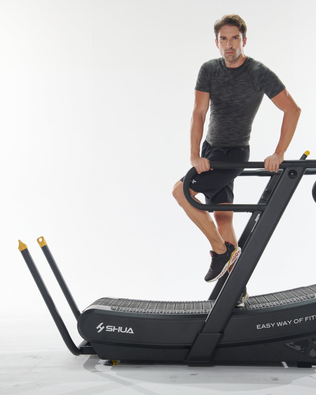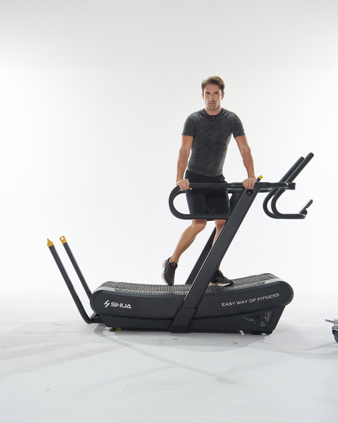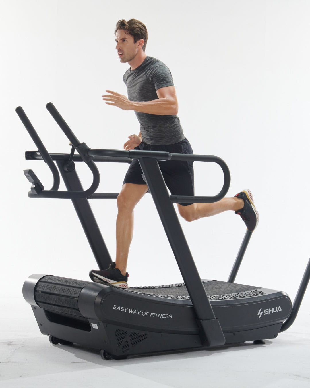 - Cintura Superiore: Cintura in gomma curva che simula la sensazione di correre o camminare in salita, favorendo una biomeccanica corretta durante l'allenamento.